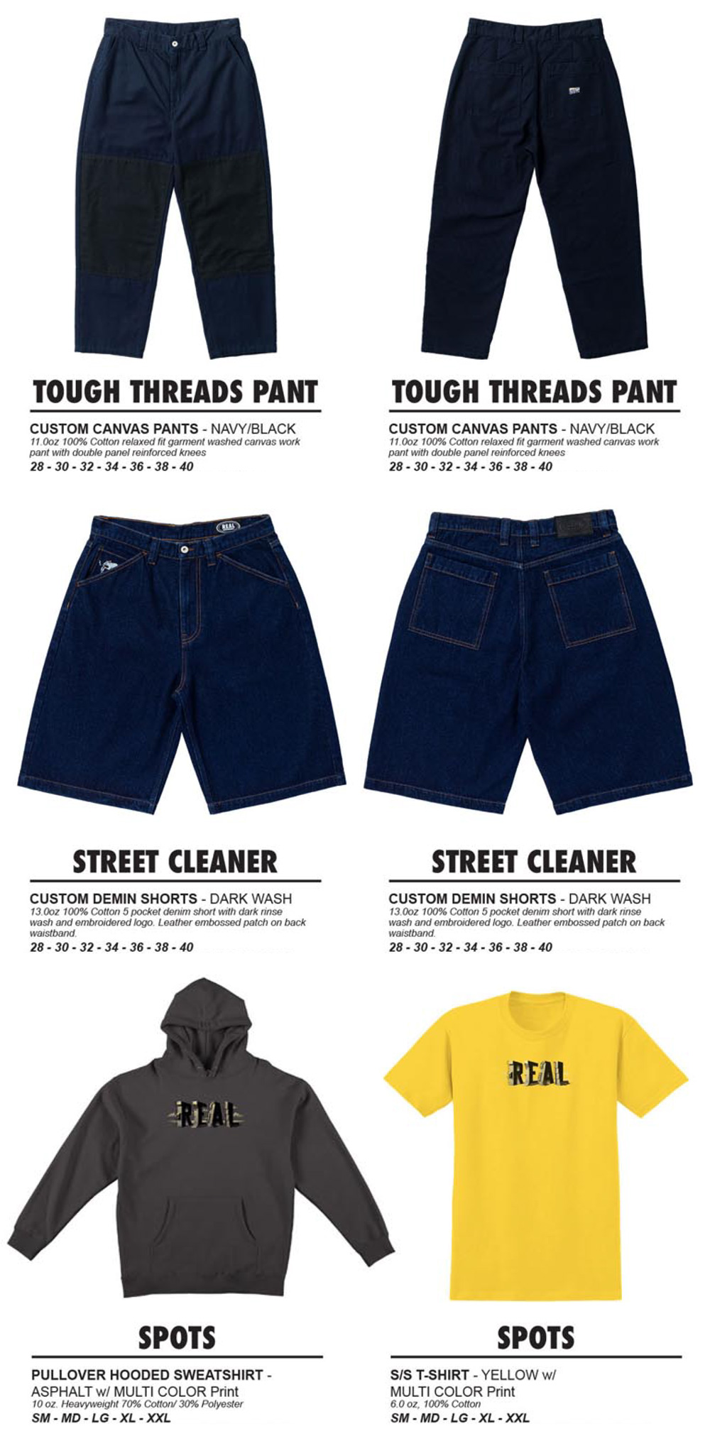 そして REAL からは TOUGH THREADS TWO-TONE PANTS、STREET CLEANER SHORTS が登場。