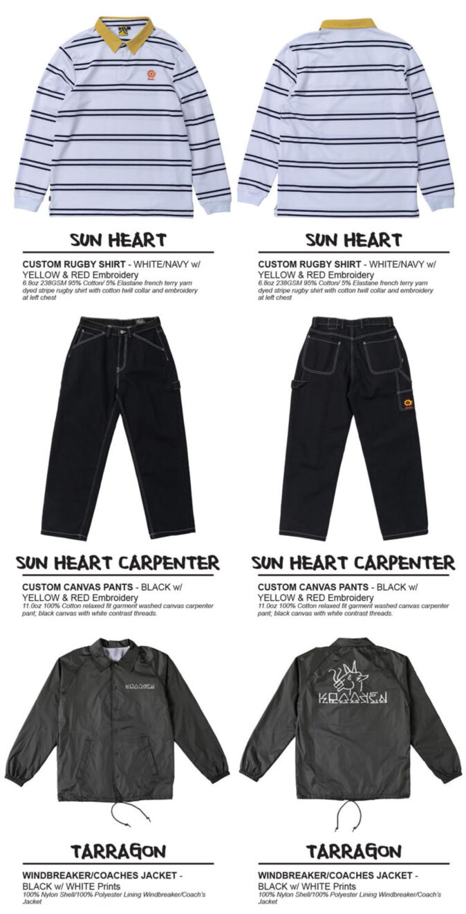 SUN HEART & TARRAGON コレクションから RUGBY SHIRTS、PANTS、CAP 、WINDBREAKER